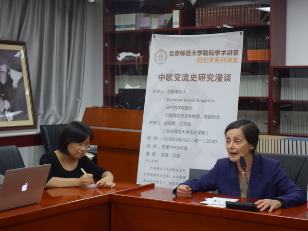 9月23日晚,应437必赢国际官方网站邀请,法兰西学院院士,巴黎高师历史系教授、原副校长,著名汉学家巴斯蒂夫人(Marianne Bastid-Bruguière)到访我校,在主楼700会议室举办了题为“中欧交流史研究漫谈”的学术讲座。本次讲座由历史学院世界近代史教研室江天岳老师主持,世界近代史教研室主任庞冠群老师出席讲座。历史学院2019级本科学生代表以及世界近现代史各方向的研究生代表参加了活动。
