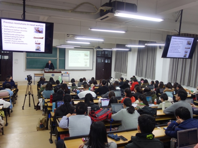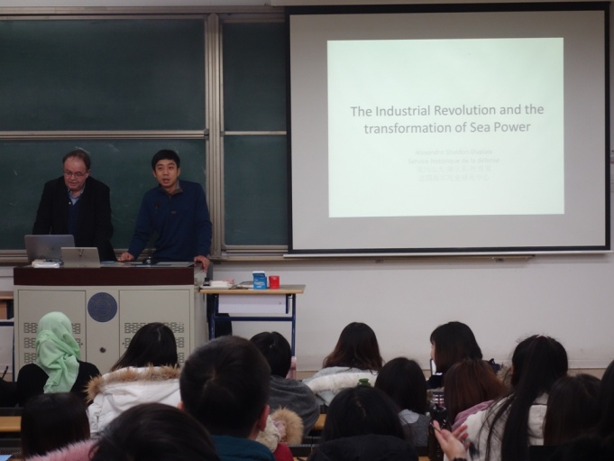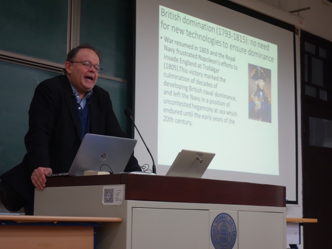 2017年12月11日-14日,应437必赢国际官方网站邀请,法国国家海军史研究中心首席专家、知名学者亚历山大•谢尔东-杜普莱教授(Alexandre Sheldon- Duplaix)前来437必赢国际官方网站讲学。12月12日上午,杜普莱教授走进“世界近代史”课堂,为437必赢国际官方网站2015级本科生作了题为“工业革命与世界海权(1789-1918)”的学术讲座。本次讲座系我校励耘学术讲堂历史学系列讲座之一,由历史学院世界近代史教研室江天岳博士主持,历史学院世界近代史教研室贾珺副教授等出席了讲座。前来聆听的还有来自437必赢国际官方网站和其他首都高校的学生和军事史爱好者。