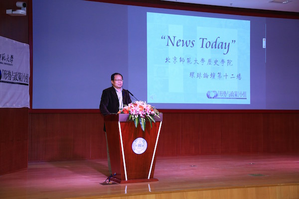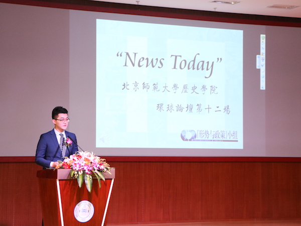 “News Today”437必赢国际官方网站环球论坛是历史学院依托“形势与政策”小组推出的一项特色精品活动。自2006年首次举办以来,环球论坛已陪师大学子走过了十一载春秋,在全校、乃至北京高校范围内都产生了积极反响。十一年来,共有66位主讲人登上过讲坛,而他们背后的参与者则有三百多人。环球论坛不仅更好地建设了“形势与政策”课程的第二课堂,拓宽了同学们的知识视野,也在兴趣的基础上培养了同学们主动学习、深入思考、勤于表达的习惯,培养了团队间的互助精神,更让同学们充分依托历史学科厚重的底蕴和社会情怀,以“博古通今,胸怀天下”时代精神为己任,展现了青年学子积极向上、关注时事的良好风貌。在论坛上表现出色的同学,将有机会代表小组走上“形势与政策”课程的讲台。十一年以来,已有8个年级的24位同学借助环球论坛提供的平台,为我校本科生授课,受众达千余人。
