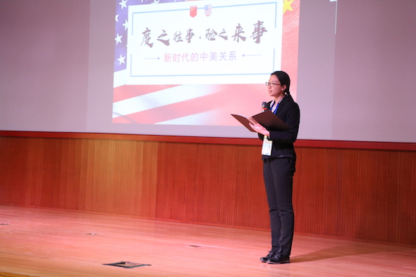 第一组代表、历史学院2017级张雪妍同学的展示题为《度之往事,验之来事——新时代下的中美关系》。她指出:作为当今世界上最重要的双边关系之一,中美关系的冷暖关乎世界和平与发展大局。两强关系处理不易,从奥巴马执政八年到如今的特朗普政府,中美关系总体趋好,但也遭遇了种种曲折。从此次特朗普访华看,美国已经充分意识到了中美关系的重要性以及中美合作共赢的必要性,与中国在“朝核问题”、经贸往来等重要问题上达成了共识。张雪妍同学最后指出,虽然中美关系中仍存在着一些问题和阻碍,但中国作为一个负责任的大国,将会继续致力于推动双方合作,共同促进世界和平。