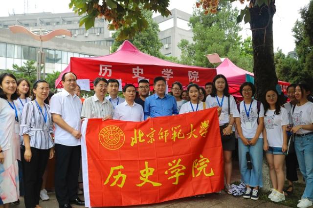 9月2日是我校2018级新生报到日。历史学院院长杨共乐老师、分党委书记郭家宏老师、副院长姜海军老师、分党委副书记王卓凯老师、分团委书记胡小溪老师、专职辅导员李力老师,以及2018级本科班班主任曲柄睿老师、丁雨老师、胥晨曦老师,2018级硕士班班主任孙会修老师、项旋老师与同学们一道在京师广场喜迎新生。
